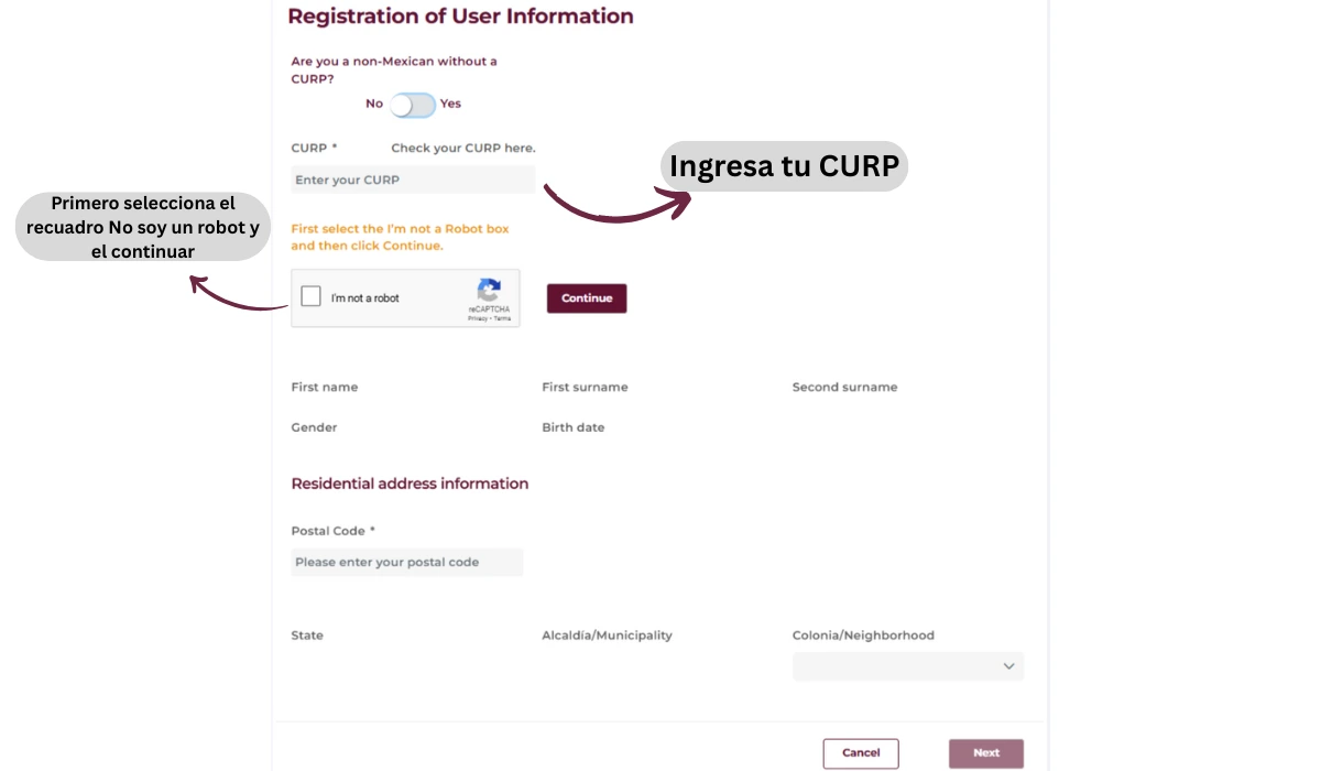 - Ingresa tu CURP, selecciona la casilla No soy robot y continúa.